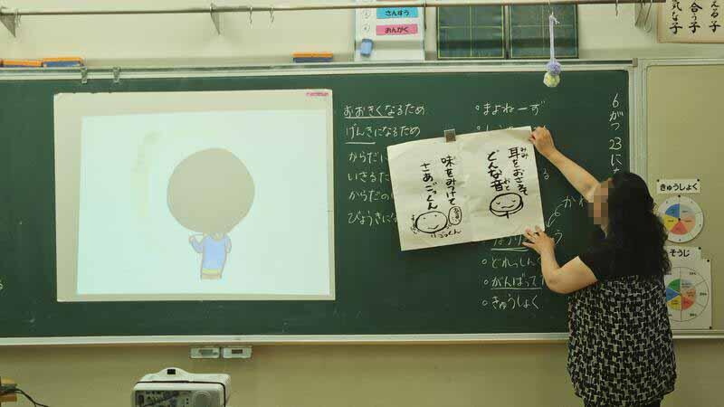 本日1・2校時に1年生を対象に栄養教諭による食育出前授業が行われました。「魔法の食べ方」と題し、子どもたちは「ピーマン食べる ぴっぴっぴー」など、野菜嫌い克服のためのおまじないを秘伝書に記入しました。それぞれが自分の目標と楽しいおまじないを胸に、野菜嫌いを克服するための一歩をスタートしました。