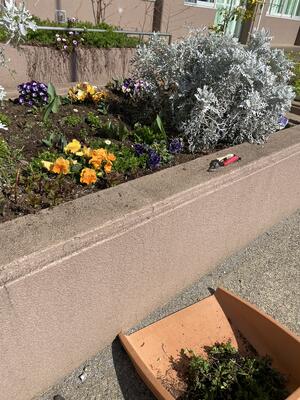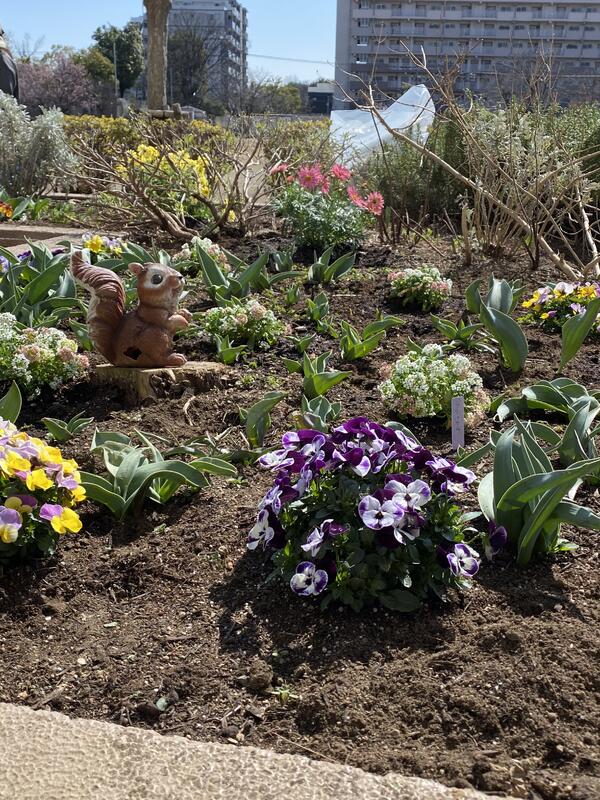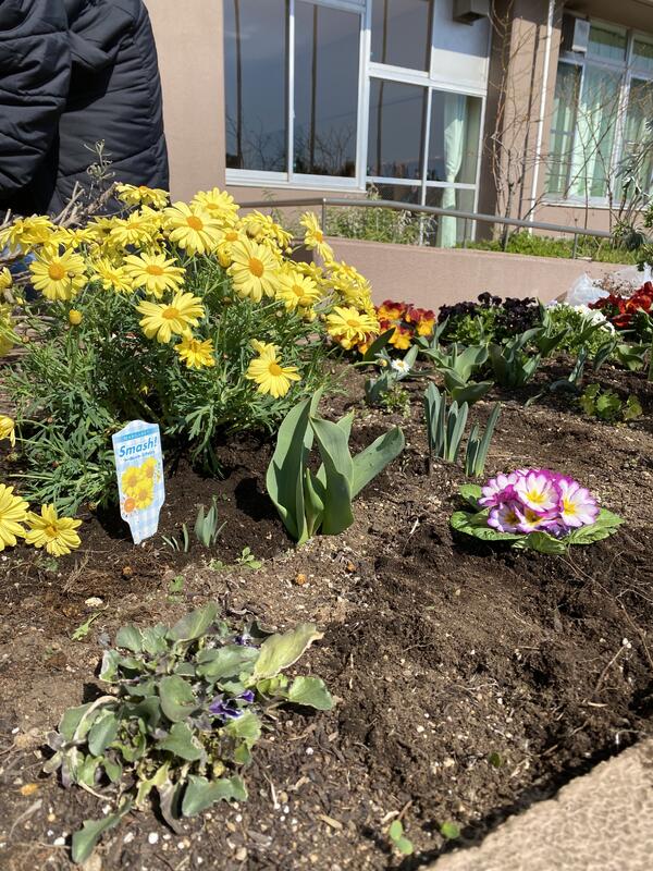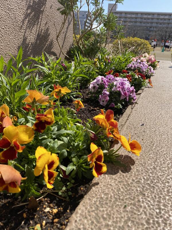 今月は卒業式、来月には入学式があるので、彩り豊かな花壇で生徒達を送り出し、そして出迎えるためにたくさんの花の苗を植え、花壇を賑やかにしました!