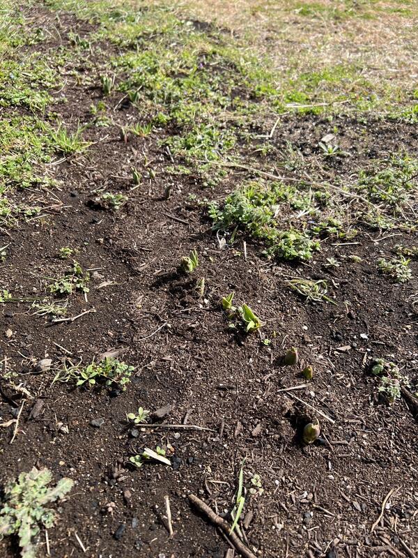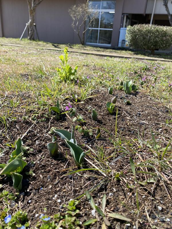 所々に、 以前の活動で植えたチューリップなどの球根の葉が出て来ていまし た。何色の花を咲かせるのかな?とても待ち遠しいです。