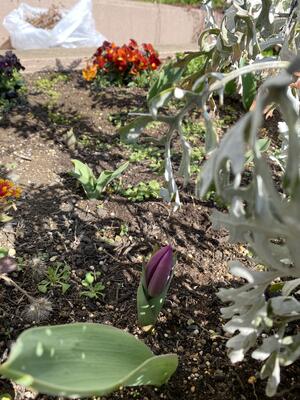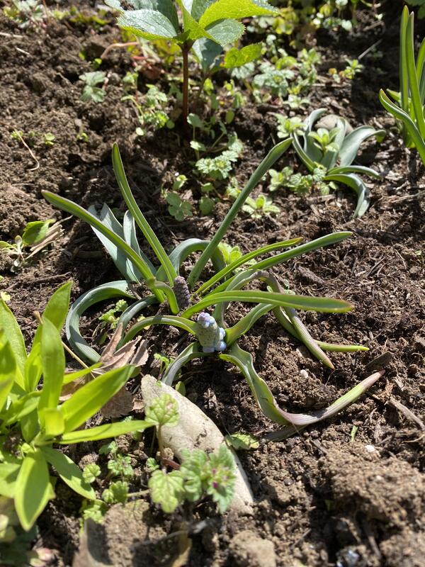 秋に植えたチューリップやムスカリなどの球根がすくすく育っていたので、空いたところにネモフィラ、アリッサムを植えました。