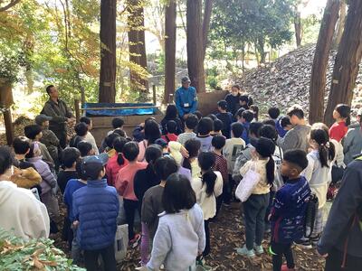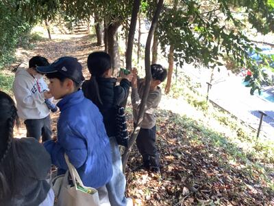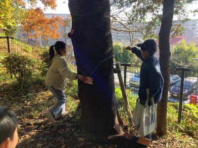 今日のめあては2つ。ひとつは秋を探すこと、もうひとつは樹名板を取り付けることです。6年前から代々の3年生が取り組んできた活動。今日新たに59枚の板が取り付けられ、総数422枚の樹名板が取り付けられたことになるそうです。暖かな日差しのもと、落ち葉を踏みしめにからきだの道を訪れた際にぜひこの板もご覧ください。