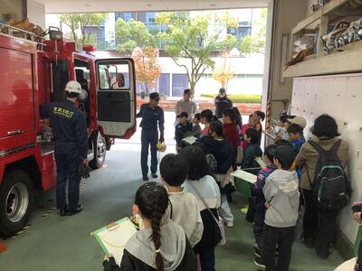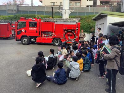 わたしたちのくらしを守る、消防士の方々から貴重なお話と体験をさせていただきました。署内の見学や消防車や機材の紹介、訓練風景も見せていただきました。出場時に防火服を着装するのに「42秒」。あまりの素早さにみんなで拍手をしました。