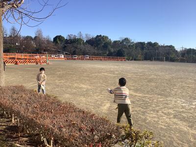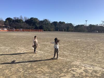 広い校庭で羽根つきに夢中になって取り組む1年生です。