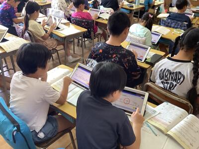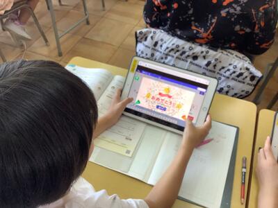 3年生の算数、「大きい数」の学習。それぞれが習熟を深めるためにタブレットを活用して問題に取り組みました。正解となると「おめでとう」の文字が表れていました。個の学びも充実させていきます。