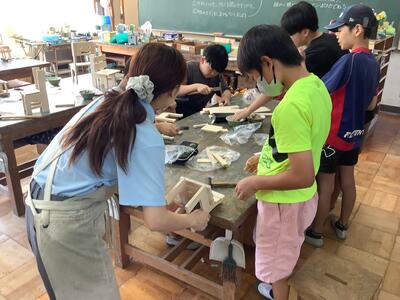 げんのうを使って、釘を打ち付けて組み立てをしていきました。2人組になって協力しながら作業を進めていました。