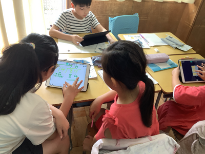 自分でまとめプリントの問題に挑戦、友達との教え合い、タブレットを使ってプラスの練習問題に取り組むなどそれぞれに学習を進めています。