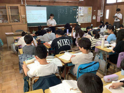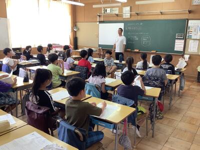 鶴牧中学校の生徒さんが職場体験で本校に来て、体験活動をしています。後方に立って、子供たちに声をかけてくれました。