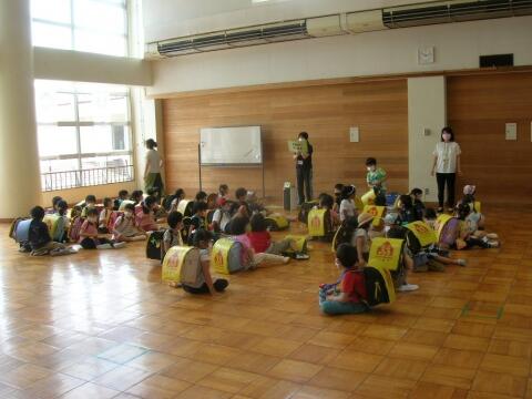 1年生は、最初多目的ホールに入って、今日一日の予定などの話を聞きました。