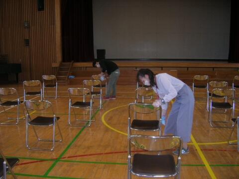 子どもたちが下校した後、教職員で手分けして消毒をしています。