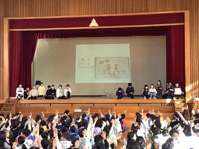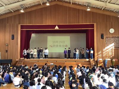 運動会を終えた翌日でしたが、図書委員会にみなさんが本にちなんだクイズを用意して、集会で発表しました。「読書の秋」本に親しんでいきたいです。