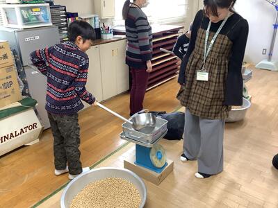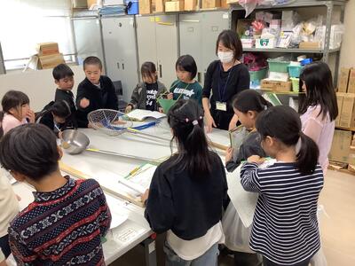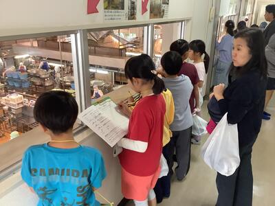 給食ができるまでの様子を知ったり、実際に調理しているところを見たりしました。調理器具を実際に触れる体験もできました。