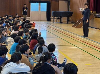 今朝は雨が降っていましたので、体育館で全校朝会を行いました。