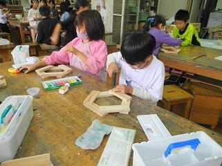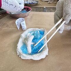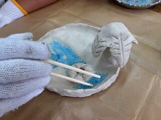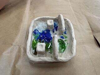 素焼きの箱庭がすでに完成しており、その水辺にする予定の部分に今日はガラスの破片を入れていっていました。