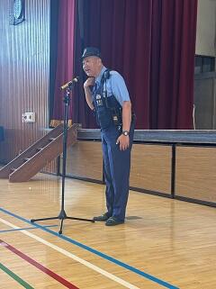 長期休業前の集会には、いつも連光寺駐在所の駐在さんもいらしていただいています。
