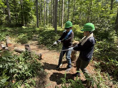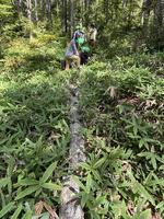 グループごとに1本切り倒し、その後、釈切りして林道に並べるまでが作業です。