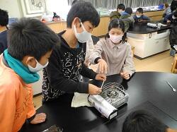 理科室の前を通ると、5年生が理科の「ものの溶け方」の発展学習として、ミョウバンの結晶づくりに取り組んでいました。
