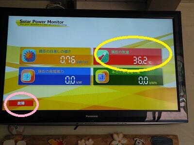 ソーラーパネルの外気温表示は黄色丸のように36.2度。