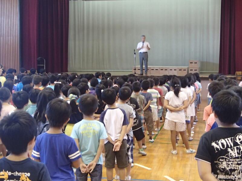 写真は今朝の始業式の様子です。学校長から、リオオリンピックの