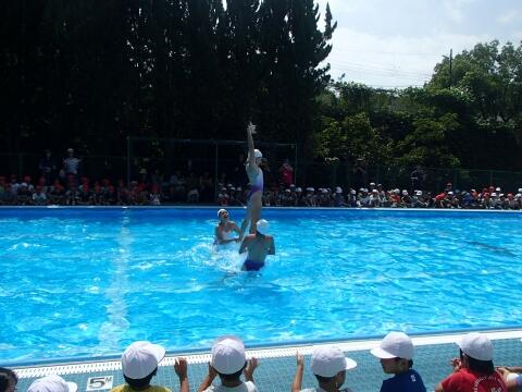 オリンピック・パラリンピック教育の一環として、9月8日にロンドンオリンピックシンクロナイズドスイミング日本代表の足立夢実選手による、4~6年生に対する講演会を実施しました。その中で逆境に負けず、夢に向かいこつこつ努力を続けることの大切さを学びました。その後、足立選手が監督を務める国士舘大学シンクロ部の学生による実技見学会を2部制でおこない、全校児童や教職員、保護者、地域の皆様がシンクロの技の解説を聞いたり、曲に合わせたシンクロの演技を見たりしました。浅いプールにもかかわらず、迫力の演技に圧倒されました。最後は6年生と給食交流をおこない、子供たちにとってアスリートと触れ合う有意義な一日となりました。