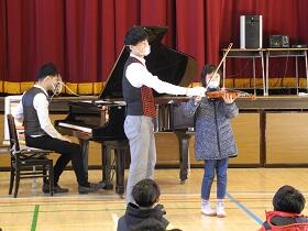 「ルパン三世」「千と千尋の神隠し」「ディズニーメドレー」など、親しみのある楽曲を演奏してくださったり、バイオリン演奏体験をしたり、曲のリズムに合わせた表紙や体の動きなど、さまざまに志向を凝らして聴いている児童を盛り上げてくれました。
