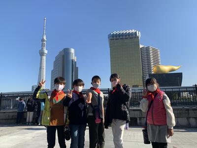 江戸博物館は、両国国技館の隣です。入口で集まっている写真ですが、左奥にスカイツリーが見えます。