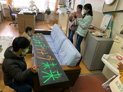 試しに点灯してみて、たまたま見に来ていた4年生も一緒に拍手。無事全文字が点灯しました。