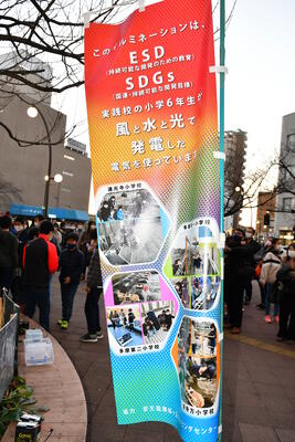 12月11日(土)に多摩市内の4校(多摩第一小学校、多摩第二小学校、連光寺小学校、東寺方小学校、多摩中学校)が再生可能エネルギーを利用したイルミネーションを製作し、点灯式を行いました。
