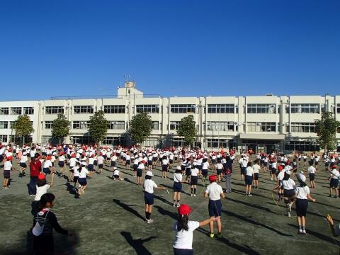 11月9日の朝、体育朝会を実施しました。運動委員が前に並び、短縄で跳ぶ技を紹介し、その後全校児童が一斉に練習を開始。雲一つない真っ青な空の下で、元気よく運動する子供たちが印象的でした。