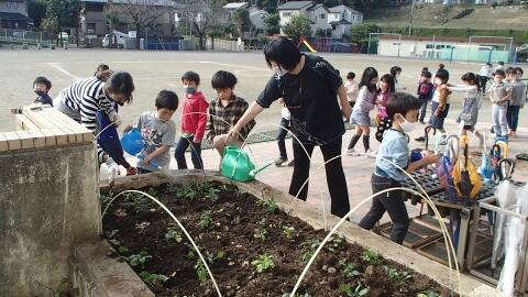 1年生が昇降口脇の花壇にフリージアやチューリップなど