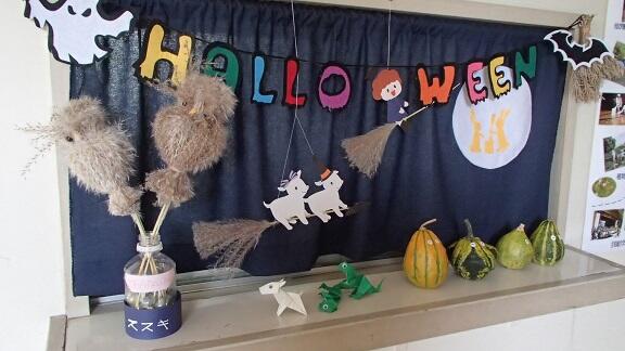 コーナーです。恐竜は、5年生の作品です。(みどりの折り紙)