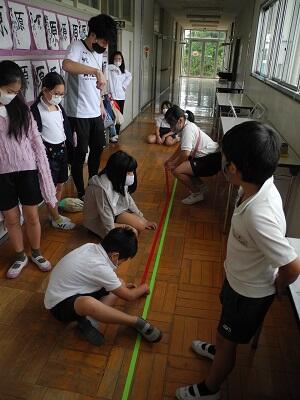 授業では、廊下で540cmと180cmのテープを使って確かめていました。