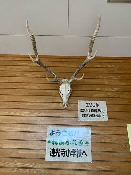 教室に帰るときに職員玄関に寄り道して、エゾジカの角を見て、触っていきました。