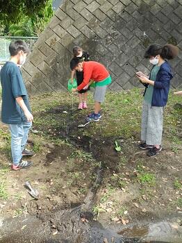 多くの学校では、砂場に流水実験機を用いて演示実験を1つだけ行いますが、連小はよい具合の土地がプールわきにあります。