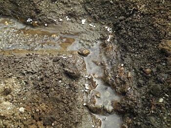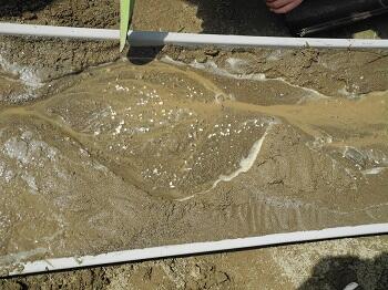 ここの斜面を利用して、川を作り、水を流し、流れがよくわかるように土壌改良剤のパーライト(軽石)の粒も流しました。