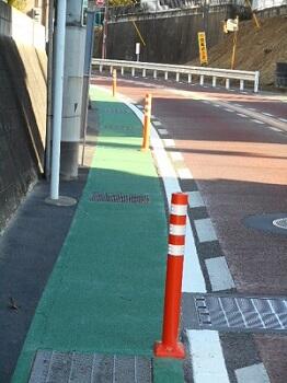 歩道のカラー化、タイヤに振動が伝わる路面の加工(ランブルストリップス)、オレンジポールが追加されました。
