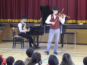 「ルパン三世」「千と千尋の神隠し」「ディズニーメドレー」など、親しみのある楽曲を演奏してくださったり、バイオリン演奏体験をしたり、曲のリズムに合わせた表紙や体の動きなど、さまざまに志向を凝らして聴いている児童を盛り上げてくれました。