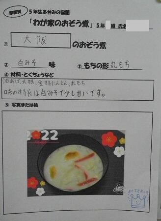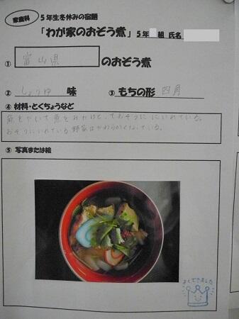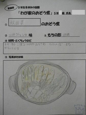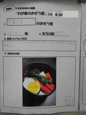 5年生が家庭科の冬休みの宿題で取り組んだ、「わが家のおぞう煮」です。