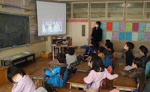 自宅と教室と、オンラインで授業参加している児童たちをつなげての三元授業です。