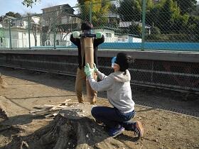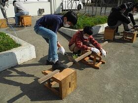 廃材や竹を割って、薪とします。手慣れた感じの6年生です。