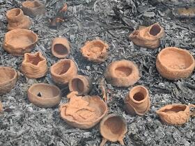 点火の前に、焼く土器を四辺において、熾火になるまで温めます(今一度水分を飛ばします)。