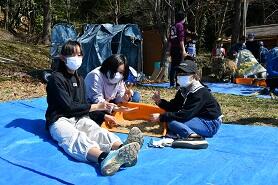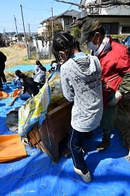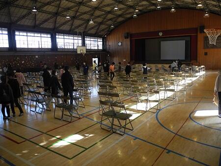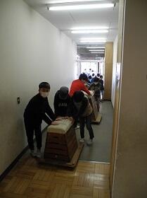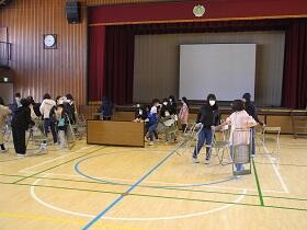 体育館にある跳び箱やマットを運び出し、椅子を舞台下から出していきます。