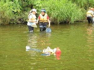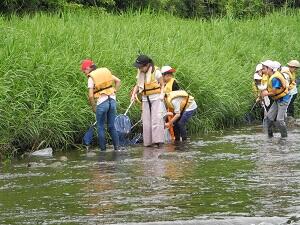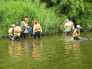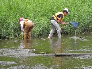 ガサガサとは、川に入り、水生生物をたも網を使ってガサガサと川岸に追い込み捕獲する活動です。