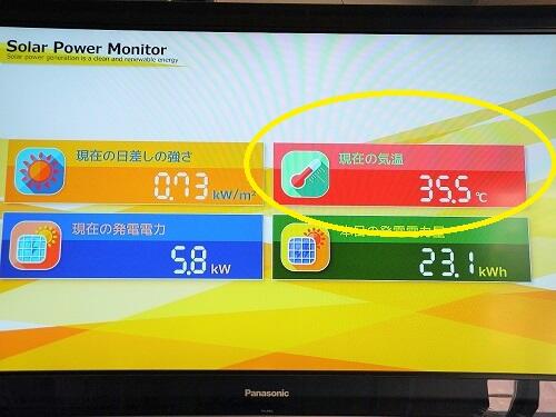 学校では、気温(ソーラーパネルの温度計を基準としています)が35度以上、または熱中症指数(WBGT)が30以上の時に、外遊び、外体育を中止しています。