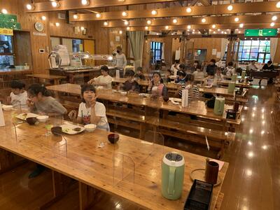長期休業中、学童クラブでは、食事の際の密を避けるために2,3年生は校舎の中の教室に入って昼食をとっています。