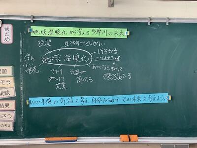 「地球温暖化から考える多摩川の未来」と題して、温暖化が今学んでいる多摩川にどんな影響を及ぼしていくのだろうかということを考えてもらい、多摩川学習のまとめにエッセンスとして生かしてもらおうというのがねらいです。