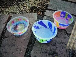水を入れて、外に置いて、氷ができるか実験しているようです。