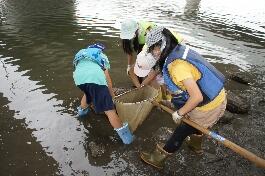 そして、最後は自然保護という大切な視点から、トロ船に入っていた採取した生き物たちを干潟に放ちます。