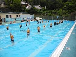 2回目の笛で、プールサイドに腰掛け、胸に水をかけます。