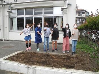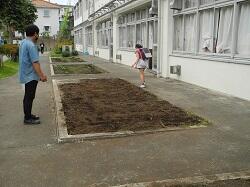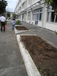 図工室前の花壇と、2年1組前の花壇に蒔きました。