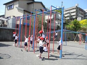 校庭の遊具エリアで、みんなにこにこ顔で遊んでいました。